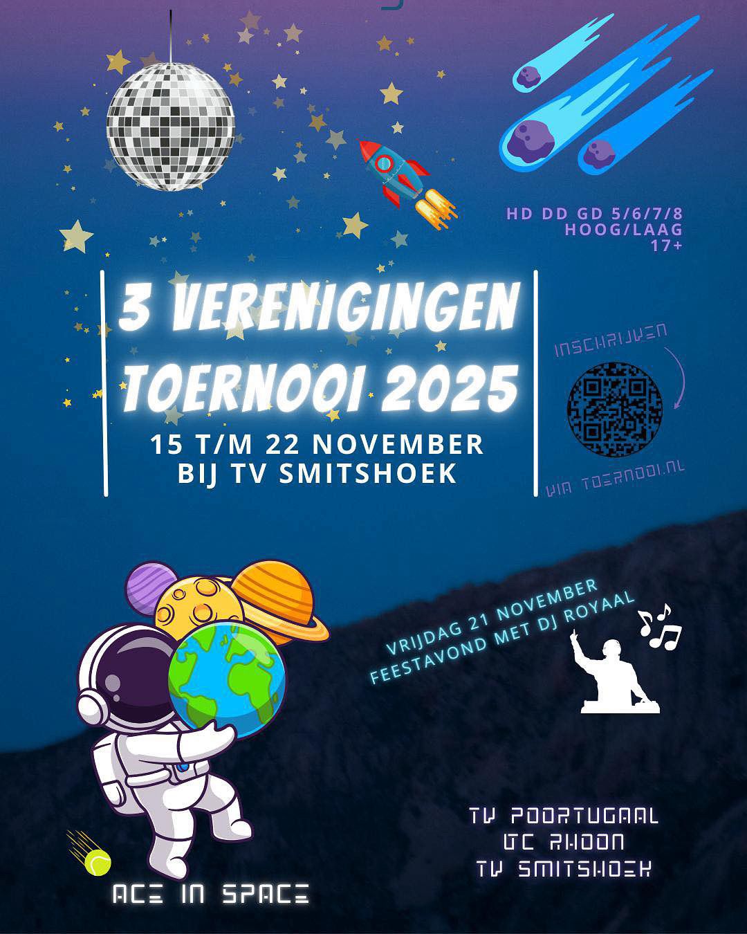 In de week van 15 t/m 22 november wordt het jaarlijkse 3 verenigingen toernooi gespeeld. Tijdens deze week gaan we de sportieve strijd aan met onze buren van tennisvereniging Poortugaal en tennisvereniging Smitshoek.
